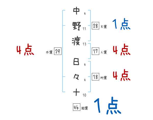 総運![]() | 中野渡日々十さんの総運は46画の1つ星!迷走することが多く苦労するかも。目先のことにとらわれないように。 あなたの人生を表す1番重要な運勢です。生涯を通じて影響する総合運となり、主に50歳以降の晩年期に影響を及ぼします。 |