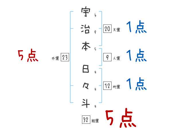 総運![]() | 宇治本日々斗さんの総運は32画の5つ星!柔軟性があり成功する。チャンスが多く金運が良い。 あなたの人生を表す1番重要な運勢です。生涯を通じて影響する総合運となり、主に50歳以降の晩年期に影響を及ぼします。 |