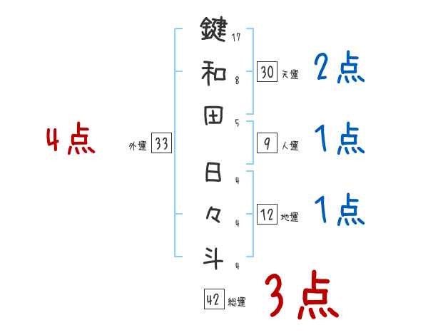 天運![]() | 鍵和田日々斗さんの天運は30画の2つ星!浮き沈みの激しさに注意しましょう。 家系が持つ宿命的な運勢を表します。祖先から受け継いだ苗字ですので自分の力が及びません。家柄を象徴します。 |