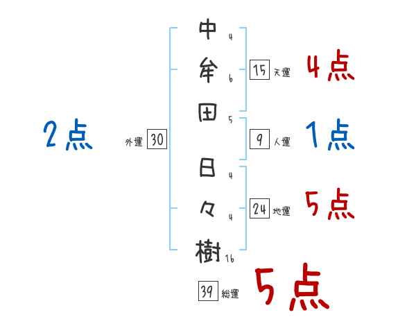 総運![]() | 中牟田日々樹さんの総運は39画の5つ星!社交性に優れ人望が厚い。人の上に立ち成功する。 あなたの人生を表す1番重要な運勢です。生涯を通じて影響する総合運となり、主に50歳以降の晩年期に影響を及ぼします。 |