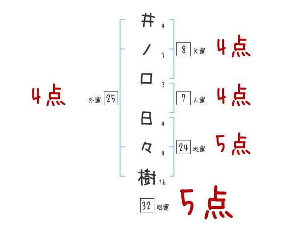 総運![]() | 井ノ口日々樹さんの総運は32画の5つ星!柔軟性があり成功する。チャンスが多く金運が良い。 あなたの人生を表す1番重要な運勢です。生涯を通じて影響する総合運となり、主に50歳以降の晩年期に影響を及ぼします。 |