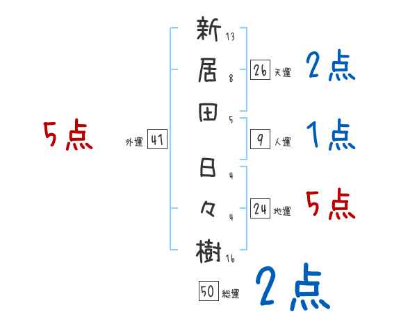 天運![]() | 新居田日々樹さんの天運は26画の2つ星!波瀾万丈かも。信頼できる人を大事にしましょう。 家系が持つ宿命的な運勢を表します。祖先から受け継いだ苗字ですので自分の力が及びません。家柄を象徴します。 |
