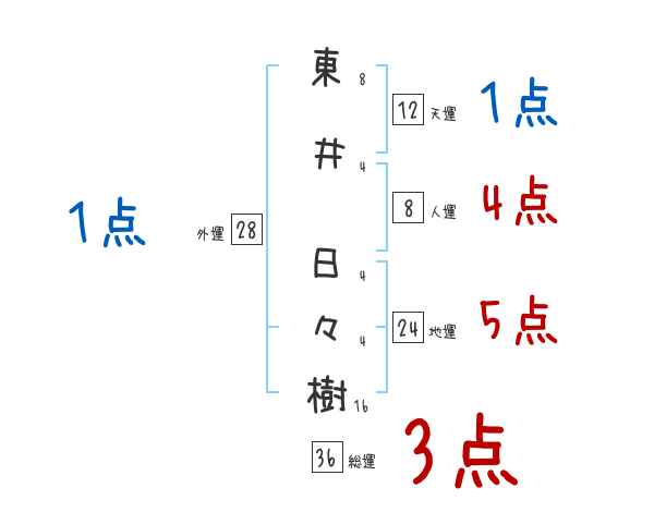 外運![]() | 東井日々樹さんの外運は28画の1つ星!家庭環境に注意。スポーツで活躍できる能力があるかも。 生活面を象徴する運勢です。外部から受ける影響力を表し、結婚運、家庭運や職場、環境への順応性を表します。 |