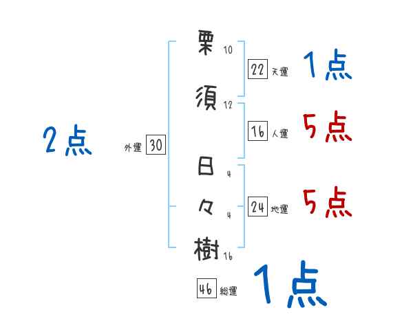 外運![]() | 栗須日々樹さんの外運は30画の2つ星!浮き沈みの激しさに注意しましょう。 生活面を象徴する運勢です。外部から受ける影響力を表し、結婚運、家庭運や職場、環境への順応性を表します。 |