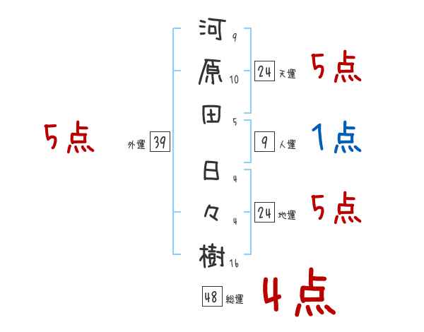外運![]() | 河原田日々樹さんの外運は39画の5つ星!社交性に優れ人望が厚い。人の上に立ち成功する。 生活面を象徴する運勢です。外部から受ける影響力を表し、結婚運、家庭運や職場、環境への順応性を表します。 |