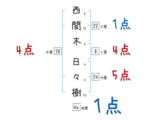外運![]() | 西間木日々樹さんの外運は38画の4つ星!温厚な性格で技術的な才能を発揮する。職人的な仕事に向いている。 生活面を象徴する運勢です。外部から受ける影響力を表し、結婚運、家庭運や職場、環境への順応性を表します。 |