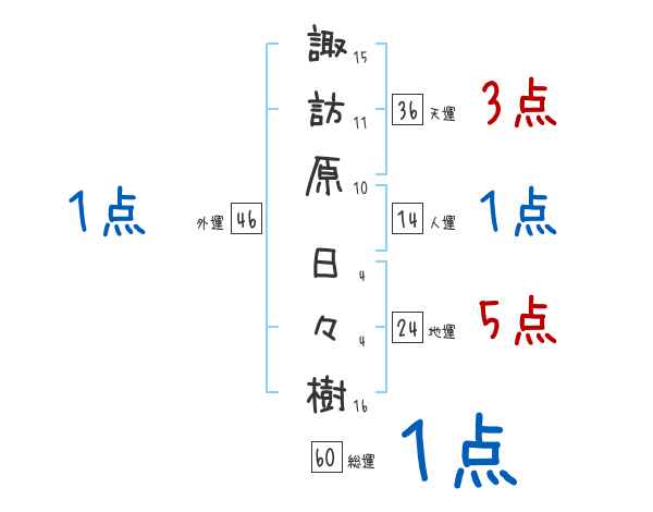 天運![]() | 諏訪原日々樹さんの天運は36画の3つ星!先見性が豊かです。多少神経質で苦労することも。 家系が持つ宿命的な運勢を表します。祖先から受け継いだ苗字ですので自分の力が及びません。家柄を象徴します。 |