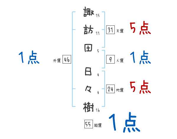 天運![]() | 諏訪田日々樹さんの天運は31画の5つ星!社交性があり判断力に優れる。順風満帆な人生で円満な生活。 家系が持つ宿命的な運勢を表します。祖先から受け継いだ苗字ですので自分の力が及びません。家柄を象徴します。 |