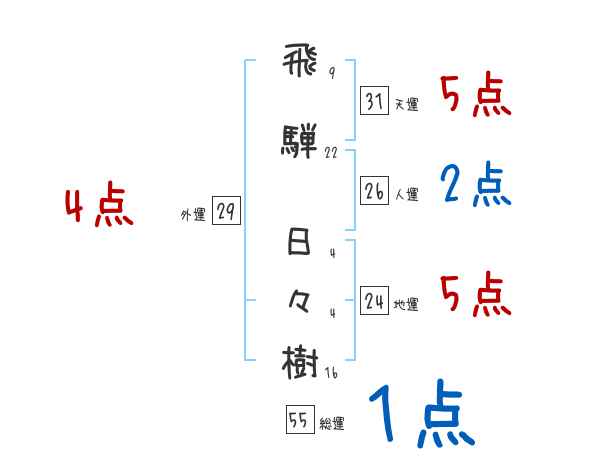 天運![]() | 飛騨日々樹さんの天運は31画の5つ星!社交性があり判断力に優れる。順風満帆な人生で円満な生活。 家系が持つ宿命的な運勢を表します。祖先から受け継いだ苗字ですので自分の力が及びません。家柄を象徴します。 |