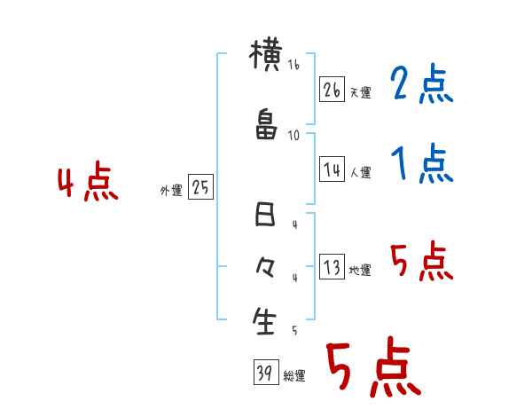 総運![]() | 横畠日々生さんの総運は39画の5つ星!社交性に優れ人望が厚い。人の上に立ち成功する。 あなたの人生を表す1番重要な運勢です。生涯を通じて影響する総合運となり、主に50歳以降の晩年期に影響を及ぼします。 |