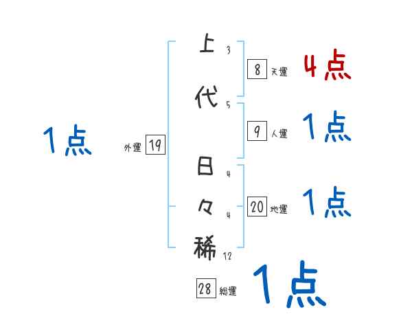 天運![]() | 上代日々稀さんの天運は8画の4つ星!勤勉家。根気強く努力し成功する。忍耐力がある。 家系が持つ宿命的な運勢を表します。祖先から受け継いだ苗字ですので自分の力が及びません。家柄を象徴します。 |