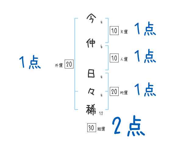 天運![]() | 今仲日々稀さんの天運は10画の1つ星!不安を感じやすい傾向。ストレスを抱えないように注意しましょう。 家系が持つ宿命的な運勢を表します。祖先から受け継いだ苗字ですので自分の力が及びません。家柄を象徴します。 |