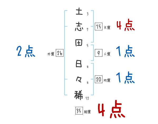 総運![]() | 土志田日々稀さんの総運は35画の4つ星!温厚な性格で感受性が高い。穏和な性格で人望が厚い。 あなたの人生を表す1番重要な運勢です。生涯を通じて影響する総合運となり、主に50歳以降の晩年期に影響を及ぼします。 |