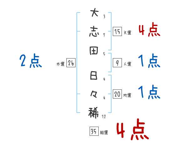 外運![]() | 大志田日々稀さんの外運は26画の2つ星!波瀾万丈かも。信頼できる人を大事にしましょう。 生活面を象徴する運勢です。外部から受ける影響力を表し、結婚運、家庭運や職場、環境への順応性を表します。 |