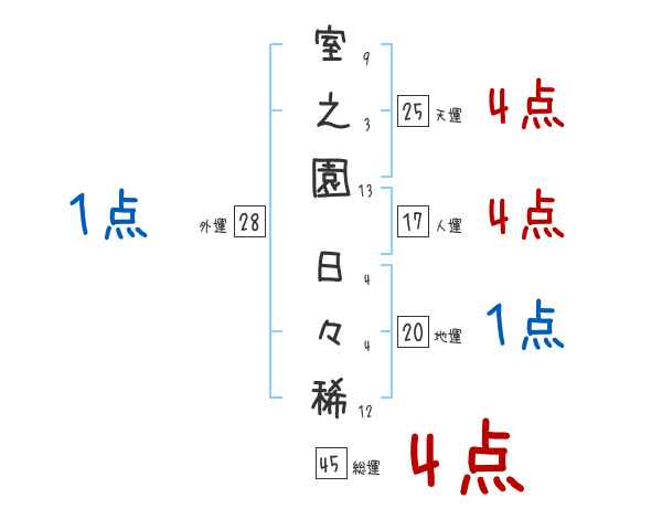 天運![]() | 室之園日々稀さんの天運は25画の4つ星!個性があり才能があふれる。強運の持ち主で発展する。 家系が持つ宿命的な運勢を表します。祖先から受け継いだ苗字ですので自分の力が及びません。家柄を象徴します。 |