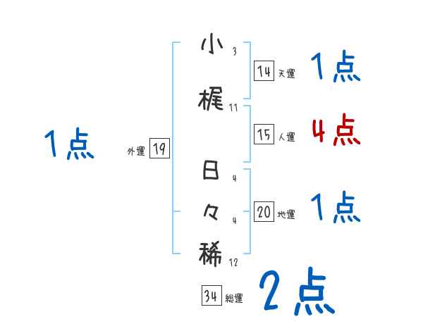 天運![]() | 小梶日々稀さんの天運は14画の1つ星!人に対して優しいがストレスを溜め込みがち。人間関係のトラブルを避けるよう気をつけましょう。 家系が持つ宿命的な運勢を表します。祖先から受け継いだ苗字ですので自分の力が及びません。家柄を象徴します。 |