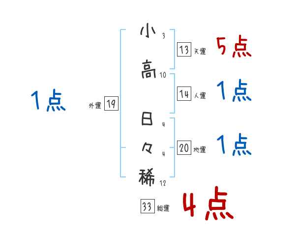 | 総運  | 小高日々稀さんの総運は33画の4つ星!権力志向でプライドが高い。勇気があり運を切り開き成功する。あなたの人生を表す1番重要な運勢です。生涯を通じて影響する総合運となり、主に50歳以降の晩年期に影響を及ぼします。 |