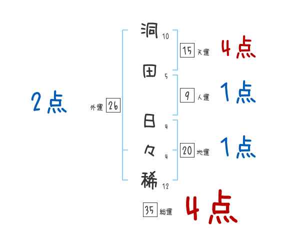 外運![]() | 洞田日々稀さんの外運は26画の2つ星!波瀾万丈かも。信頼できる人を大事にしましょう。 生活面を象徴する運勢です。外部から受ける影響力を表し、結婚運、家庭運や職場、環境への順応性を表します。 |