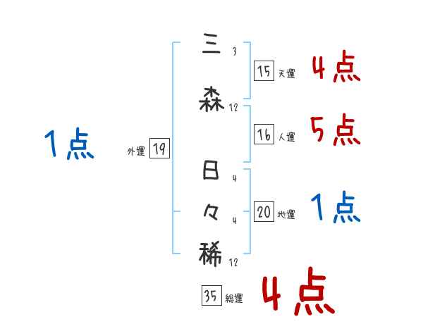 | 総運  | 三森日々稀さんの総運は35画の4つ星!温厚な性格で感受性が高い。穏和な性格で人望が厚い。あなたの人生を表す1番重要な運勢です。生涯を通じて影響する総合運となり、主に50歳以降の晩年期に影響を及ぼします。 |
