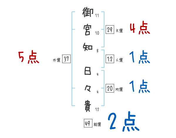 外運![]() | 御宮知日々貴さんの外運は37画の5つ星!努力家で順応性に優れる。現実的な考え方ができ忠実に物事をこなす。 生活面を象徴する運勢です。外部から受ける影響力を表し、結婚運、家庭運や職場、環境への順応性を表します。 |