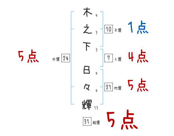 天運![]() | 木之下日々輝さんの天運は10画の1つ星!不安を感じやすい傾向。ストレスを抱えないように注意しましょう。 家系が持つ宿命的な運勢を表します。祖先から受け継いだ苗字ですので自分の力が及びません。家柄を象徴します。 |