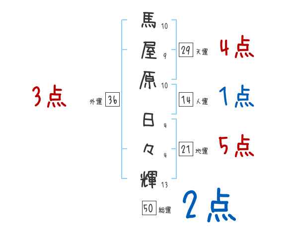 外運![]() | 馬屋原日々輝さんの外運は36画の3つ星!先見性が豊かです。多少神経質で苦労することも。 生活面を象徴する運勢です。外部から受ける影響力を表し、結婚運、家庭運や職場、環境への順応性を表します。 |