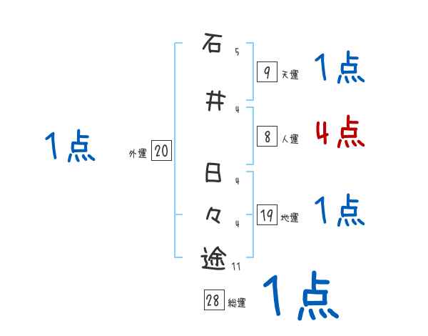 総運![]() | 石井日々途さんの総運は28画の1つ星!家庭環境に注意。スポーツで活躍できる能力があるかも。 あなたの人生を表す1番重要な運勢です。生涯を通じて影響する総合運となり、主に50歳以降の晩年期に影響を及ぼします。 |