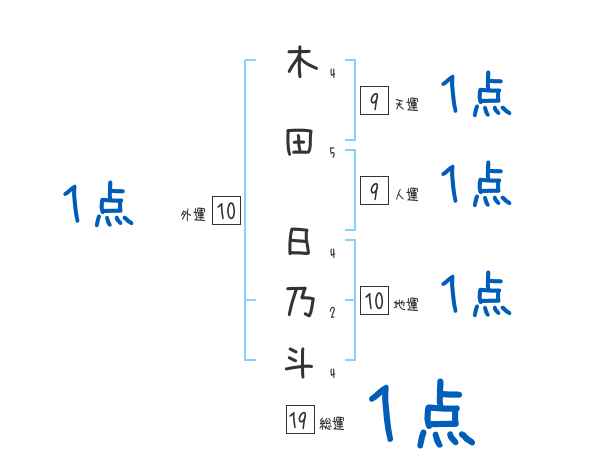 天運![]() | 木田日乃斗さんの天運は9画の1つ星!消極的で才能を発揮することが苦手なことも。周りの意見に耳を傾けましょう。 家系が持つ宿命的な運勢を表します。祖先から受け継いだ苗字ですので自分の力が及びません。家柄を象徴します。 |