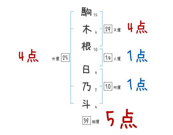 総運![]() | 駒木根日乃斗さんの総運は39画の5つ星!社交性に優れ人望が厚い。人の上に立ち成功する。 あなたの人生を表す1番重要な運勢です。生涯を通じて影響する総合運となり、主に50歳以降の晩年期に影響を及ぼします。 |
