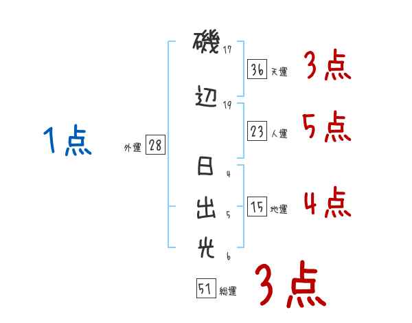 外運![]() | 磯辺日出光さんの外運は28画の1つ星!家庭環境に注意。スポーツで活躍できる能力があるかも。 生活面を象徴する運勢です。外部から受ける影響力を表し、結婚運、家庭運や職場、環境への順応性を表します。 |