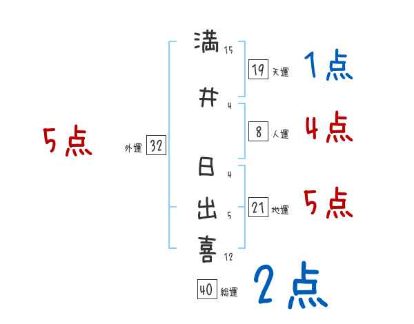 外運![]() | 満井日出喜さんの外運は32画の5つ星!柔軟性があり成功する。チャンスが多く金運が良い。 生活面を象徴する運勢です。外部から受ける影響力を表し、結婚運、家庭運や職場、環境への順応性を表します。 |