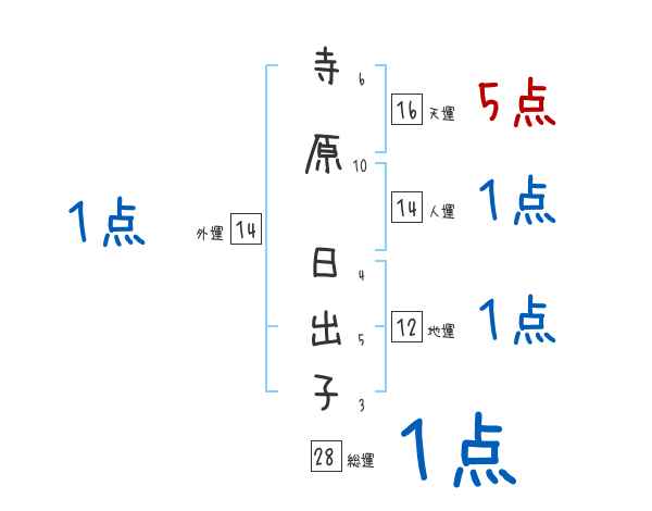 天運![]() | 寺原日出子さんの天運は16画の5つ星!人望が厚く大きく発展する。逆転成功が見える。 家系が持つ宿命的な運勢を表します。祖先から受け継いだ苗字ですので自分の力が及びません。家柄を象徴します。 |