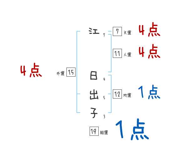 天運![]() | 江日出子さんの天運は7画の4つ星!強い意志や信念を持ち独立心が強い。自立する。 家系が持つ宿命的な運勢を表します。祖先から受け継いだ苗字ですので自分の力が及びません。家柄を象徴します。 |