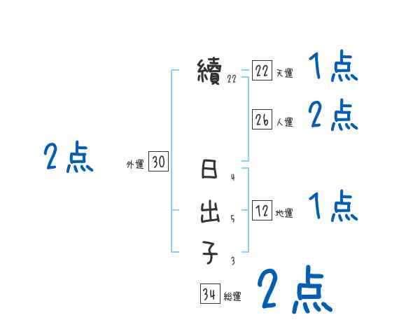 天運![]() | 續日出子さんの天運は22画の1つ星!努力することが苦手ないっぽう手先が器用。芸術性にも優れる。 家系が持つ宿命的な運勢を表します。祖先から受け継いだ苗字ですので自分の力が及びません。家柄を象徴します。 |
