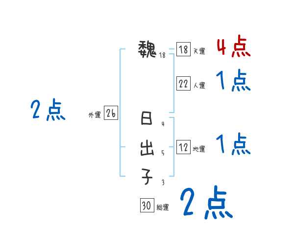 天運![]() | 魏日出子さんの天運は18画の4つ星!情熱的で剛気。忍耐力があり信頼される。 家系が持つ宿命的な運勢を表します。祖先から受け継いだ苗字ですので自分の力が及びません。家柄を象徴します。 |
