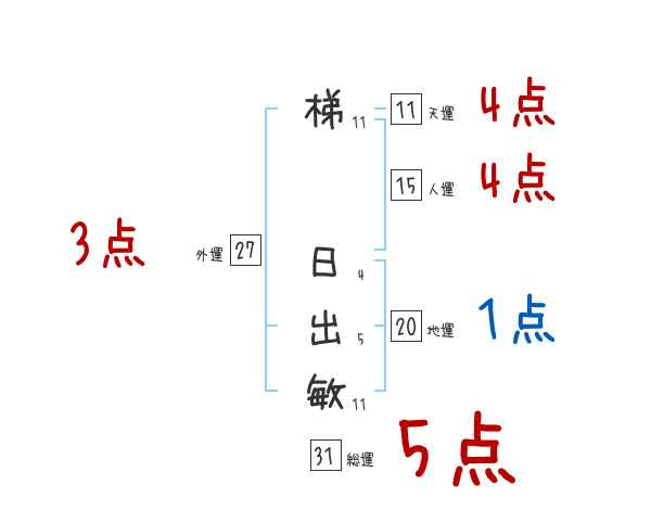 天運![]() | 梯日出敏さんの天運は11画の4つ星!着実に富や地位を得る幸運な人生。 家系が持つ宿命的な運勢を表します。祖先から受け継いだ苗字ですので自分の力が及びません。家柄を象徴します。 |