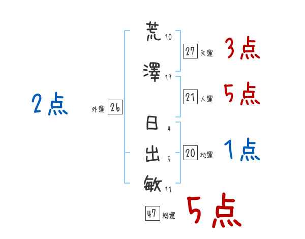 外運![]() | 荒澤日出敏さんの外運は26画の2つ星!波瀾万丈かも。信頼できる人を大事にしましょう。 生活面を象徴する運勢です。外部から受ける影響力を表し、結婚運、家庭運や職場、環境への順応性を表します。 |