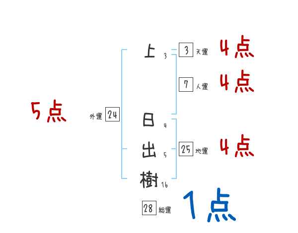天運![]() | 上日出樹さんの天運は3画の4つ星!活動的で才能に恵まれ、多くの信頼を得る。希望に満ち成長する。 家系が持つ宿命的な運勢を表します。祖先から受け継いだ苗字ですので自分の力が及びません。家柄を象徴します。 |