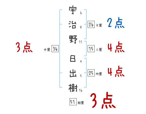 外運![]() | 宇治野日出樹さんの外運は36画の3つ星!先見性が豊かです。多少神経質で苦労することも。 生活面を象徴する運勢です。外部から受ける影響力を表し、結婚運、家庭運や職場、環境への順応性を表します。 |