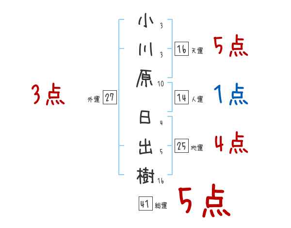 総運![]() | 小川原日出樹さんの総運は41画の5つ星!大志を抱き、目標に向かって実力を発揮し達成する。温和な性格。 あなたの人生を表す1番重要な運勢です。生涯を通じて影響する総合運となり、主に50歳以降の晩年期に影響を及ぼします。 |