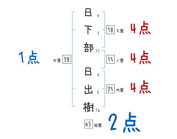 天運![]() | 日下部日出樹さんの天運は18画の4つ星!情熱的で剛気。忍耐力があり信頼される。 家系が持つ宿命的な運勢を表します。祖先から受け継いだ苗字ですので自分の力が及びません。家柄を象徴します。 |