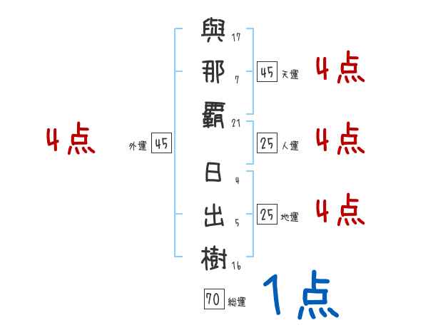 天運![]() | 與那覇日出樹さんの天運は45画の4つ星!もくもくと物事を進め達成する。地味な努力家。 家系が持つ宿命的な運勢を表します。祖先から受け継いだ苗字ですので自分の力が及びません。家柄を象徴します。 |