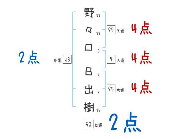 天運![]() | 野々口日出樹さんの天運は25画の4つ星!個性があり才能があふれる。強運の持ち主で発展する。 家系が持つ宿命的な運勢を表します。祖先から受け継いだ苗字ですので自分の力が及びません。家柄を象徴します。 |