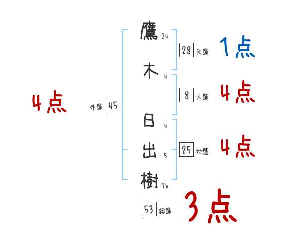 天運![]() | 鷹木日出樹さんの天運は28画の1つ星!家庭環境に注意。スポーツで活躍できる能力があるかも。 家系が持つ宿命的な運勢を表します。祖先から受け継いだ苗字ですので自分の力が及びません。家柄を象徴します。 |