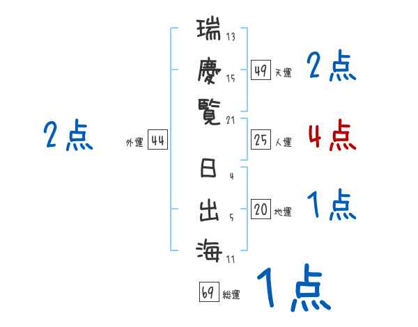 天運![]() | 瑞慶覧日出海さんの天運は49画の2つ星!不安定な性格で明暗がある人生。周りの人には支援されやすい。 家系が持つ宿命的な運勢を表します。祖先から受け継いだ苗字ですので自分の力が及びません。家柄を象徴します。 |