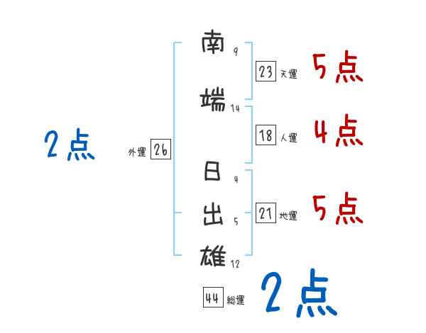 総運![]() | 南端日出雄さんの総運は44画の2つ星!誠実で慎重な性格。物事を考えすぎないように注意しましょう。 あなたの人生を表す1番重要な運勢です。生涯を通じて影響する総合運となり、主に50歳以降の晩年期に影響を及ぼします。 |