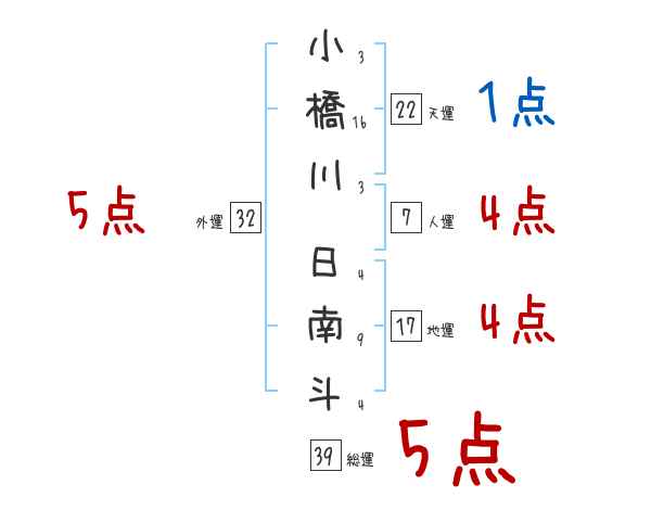 外運![]() | 小橋川日南斗さんの外運は32画の5つ星!柔軟性があり成功する。チャンスが多く金運が良い。 生活面を象徴する運勢です。外部から受ける影響力を表し、結婚運、家庭運や職場、環境への順応性を表します。 |