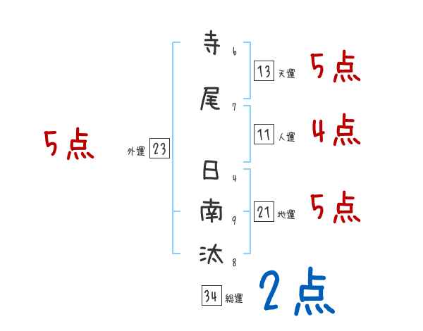 天運![]() | 寺尾日南汰さんの天運は13画の5つ星!才能に恵まれ人気がある。名声を手に入れる。円満な人生。 家系が持つ宿命的な運勢を表します。祖先から受け継いだ苗字ですので自分の力が及びません。家柄を象徴します。 |