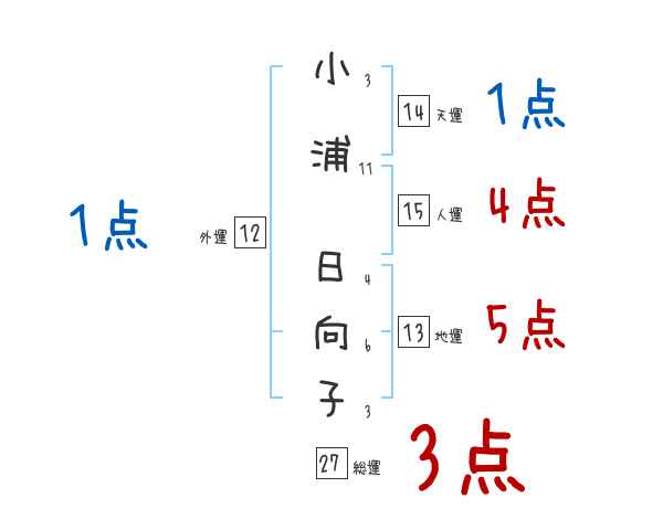 天運![]() | 小浦日向子さんの天運は14画の1つ星!人に対して優しいがストレスを溜め込みがち。人間関係のトラブルを避けるよう気をつけましょう。 家系が持つ宿命的な運勢を表します。祖先から受け継いだ苗字ですので自分の力が及びません。家柄を象徴します。 |