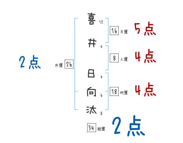 外運![]() | 喜井日向汰さんの外運は26画の2つ星!波瀾万丈かも。信頼できる人を大事にしましょう。 生活面を象徴する運勢です。外部から受ける影響力を表し、結婚運、家庭運や職場、環境への順応性を表します。 |